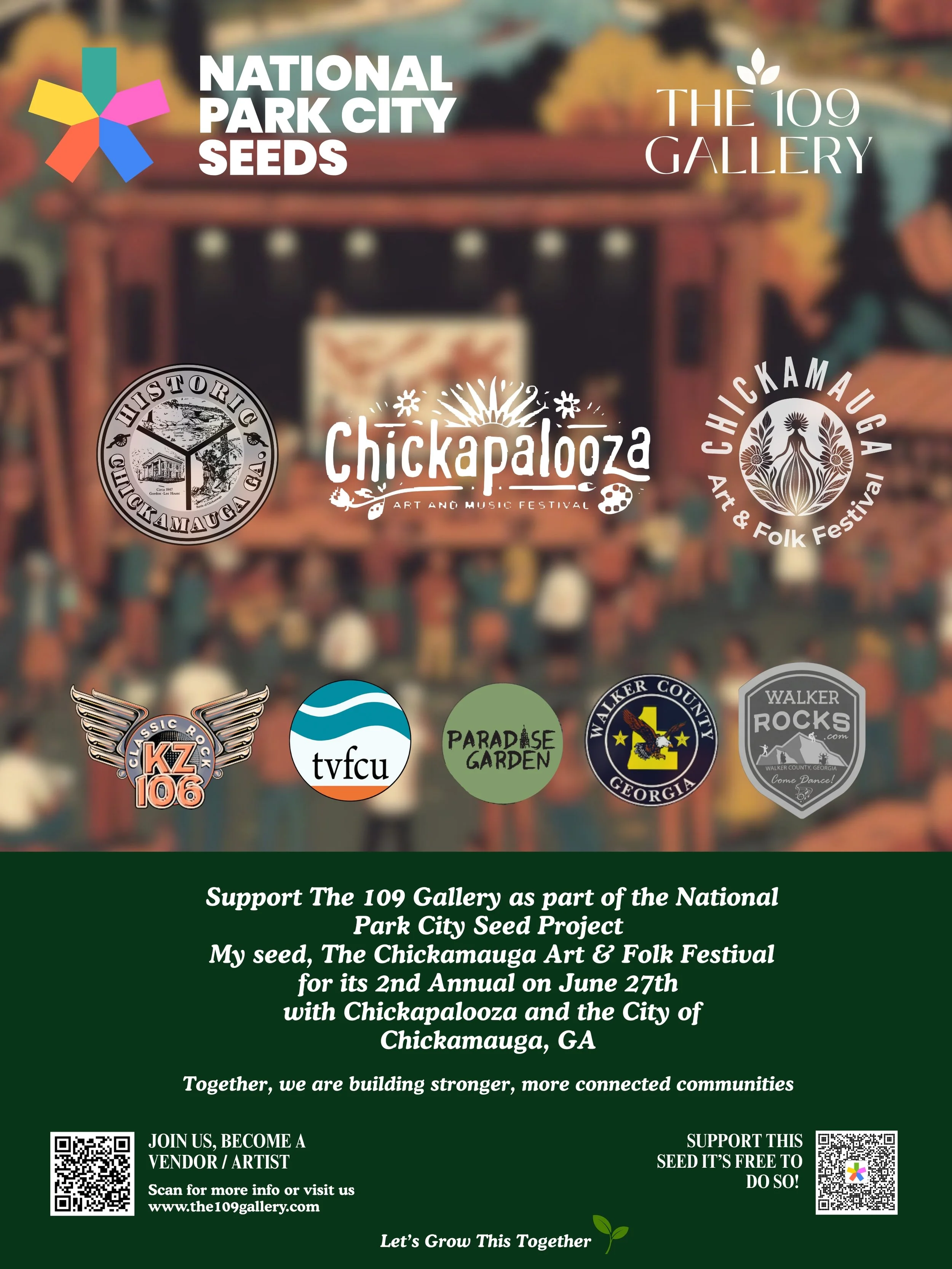 The Chickamauga Art & Folk Festival, hosted by The 109 Gallery in partnership with the City of Chickamauga, Howard Finster’s Paradise Garden, Walker Rocks, and KZ106, invites artists, makers, performers, and food vendors to participate in this growing community celebration of art, music, and regional culture.